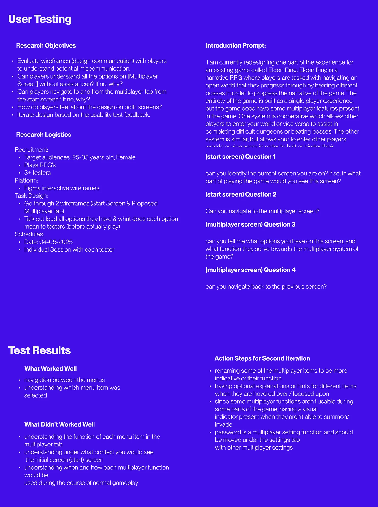 This project, completed for ELVTR’s UX/UI in Gaming course, analyzes Elden Ring’s multiplayer UI and suggests improvements. I designed and tested new wireframes and created a redesigned menu to support these changes.