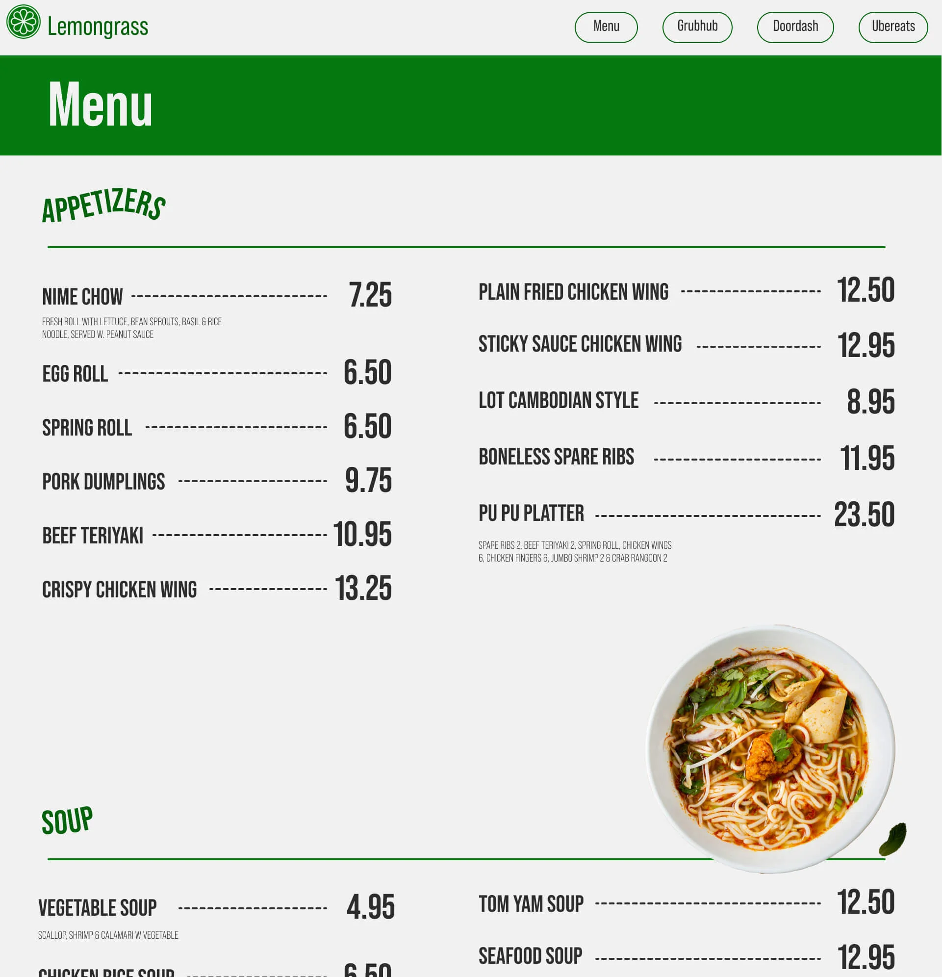 I was fortunate enough to find a client to give me as much creative liberty as Ron (the Lemongrass owner) when it comes to overhaul their business user experience and visual design. Streamlining the onboarding process from their website to their food delivery pages is something that will make a big difference in reducing customer turnover. The new redesign and site is expected to come online with the restaurant reopening after its renovation, but this one aspect of making the design and menus consistent across all of the restaurants storefront is something I think the owner could do before the renovations especially since they will be operating as a cloud kitchen during the renovations. Overall i'm excited to see the new site and redesign and what new customer behavior will be gleaned after launching the new site.