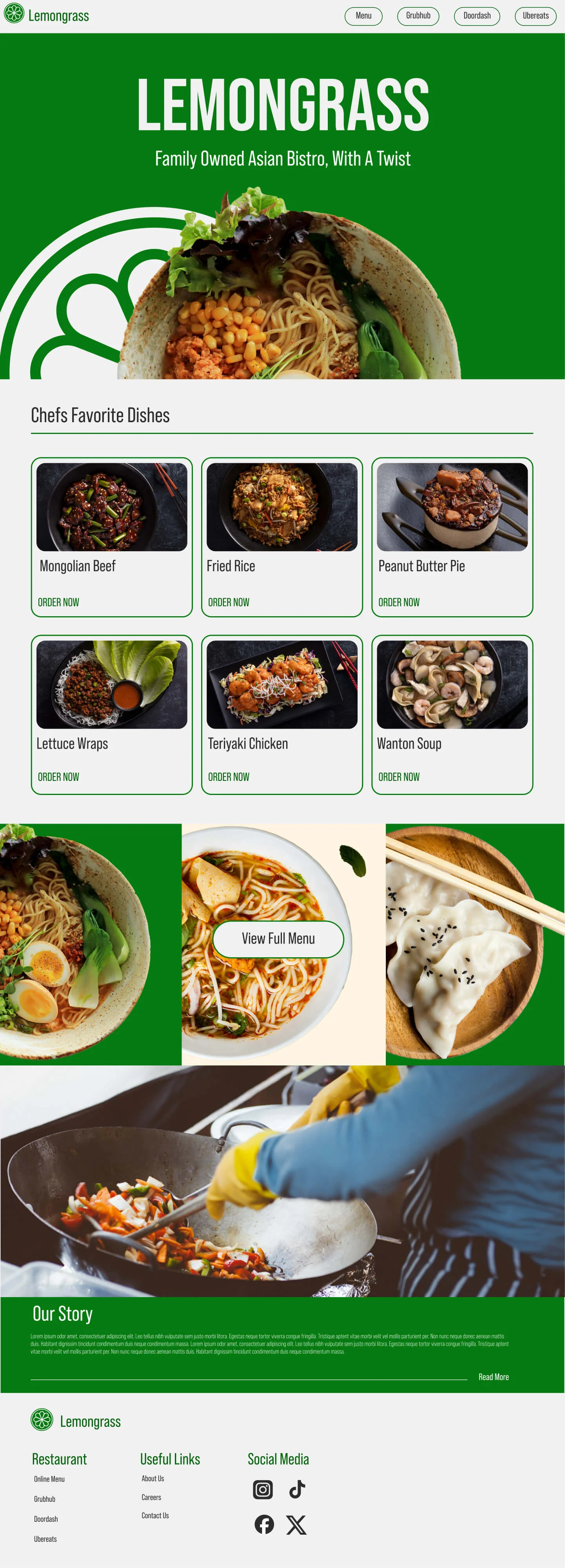 In the summer of 2024, the restaurant owner of an asian bistro named Lemongrass in Warwick Rhode Island reached out to me. His restaurant was going to be expanding and undergoing a redesign and he wanted someone with both UX and web development experience to completely redesign and unify his restaurant's logo, visuals, and website to match the look and feel of the redesign as well as to streamline the customer online ordering process. Through my redesign, I was able to unify the restaurant's brand identity to match their upcoming redesign and streamline the checkout system for customers ordering online. The new platform will launch with the re-opening of the restaurant.