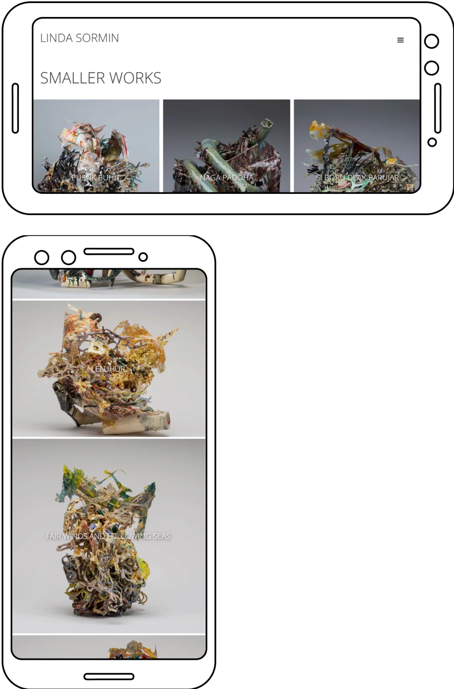 Linda Sormin, an award winning and museum exhibiting ceramicist, hired me to redesign her website. Her old wordpress website was out-dated, hard to navigate, and overall did a poor job of highlighting her unique and talented work. Through our discussions and iterative prototyping in Figma, I delivered a finished website in Webflow that showcased her work and was responsive and easy to use across all devices.